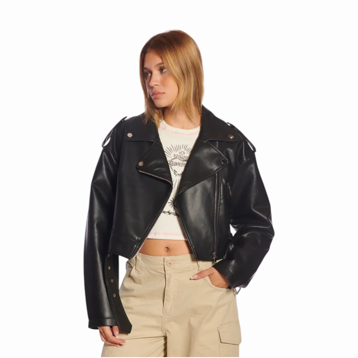 - Campera biker corta de PU con cinturón, cierres y accesorios metálicos.