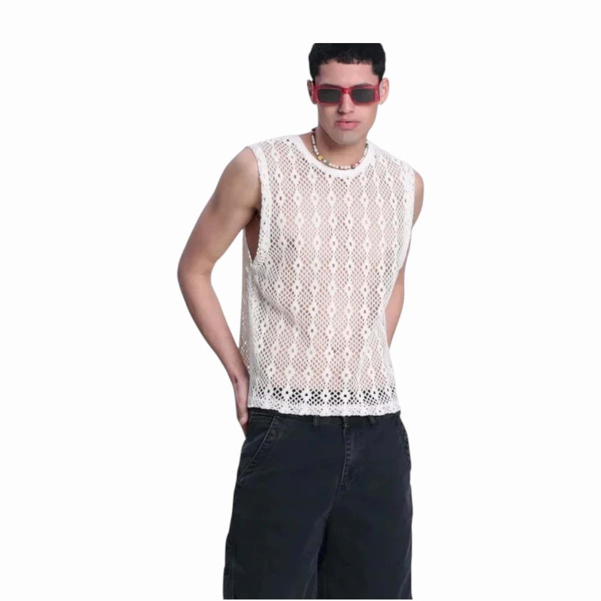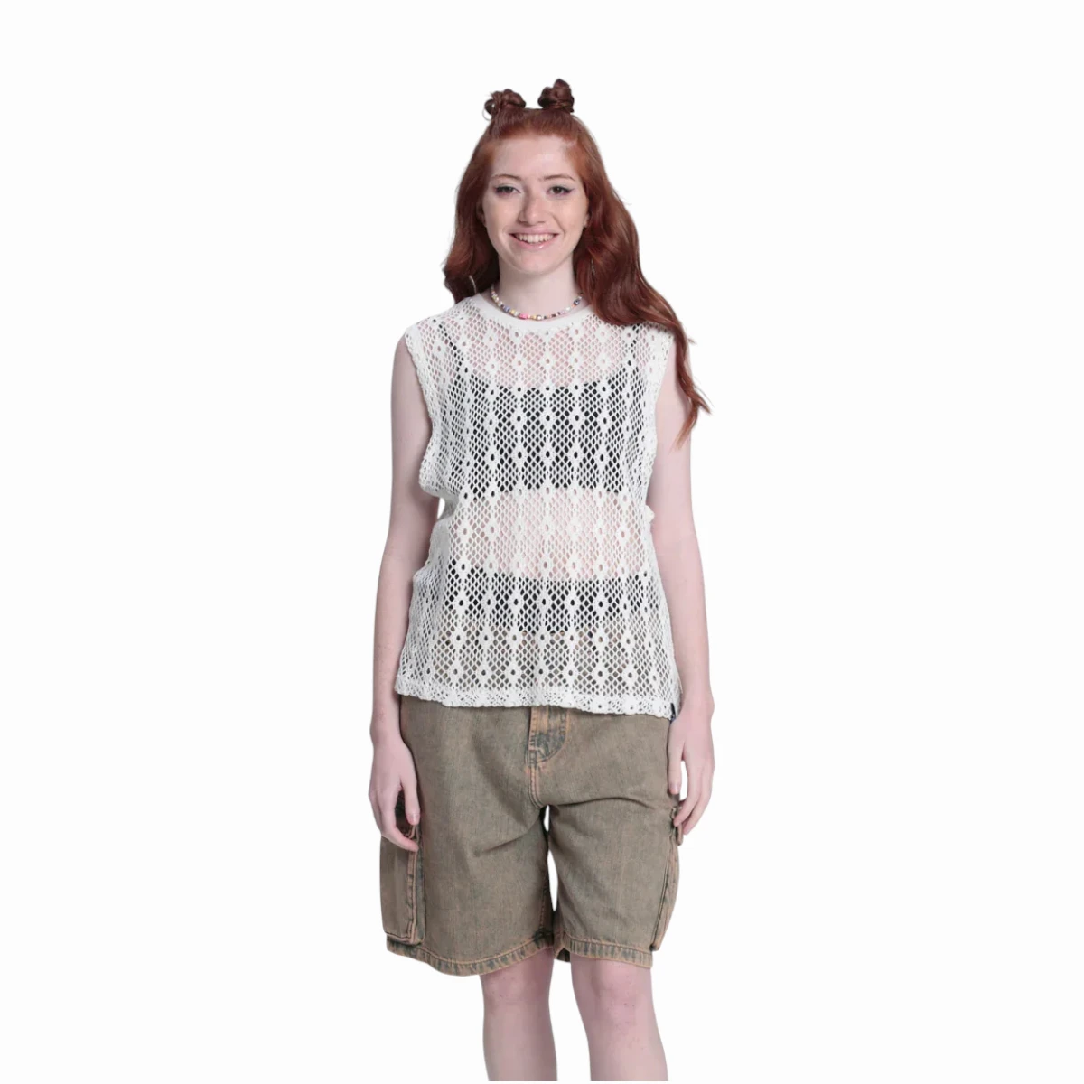 - Remera sin mangas con tejido calado 100% algodón.